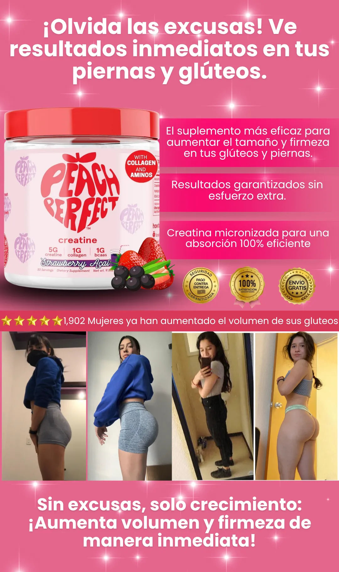 Los resultados comienzan a notarse generalmente entre 2 y 4 semanas de uso constante. Notarás un aumento de volumen en tus glúteos y piernas, así como mayor firmeza en esas áreas.