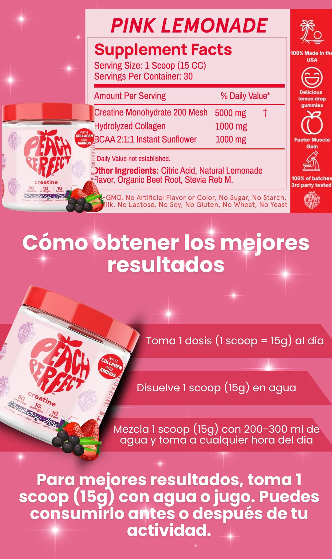 Toma 1 scoop (15g) al día, disuelto en 200-300 ml de agua o tu bebida favorita. Puedes tomarlo en cualquier momento del día, aunque muchas personas prefieren hacerlo antes o después de su actividad diaria.