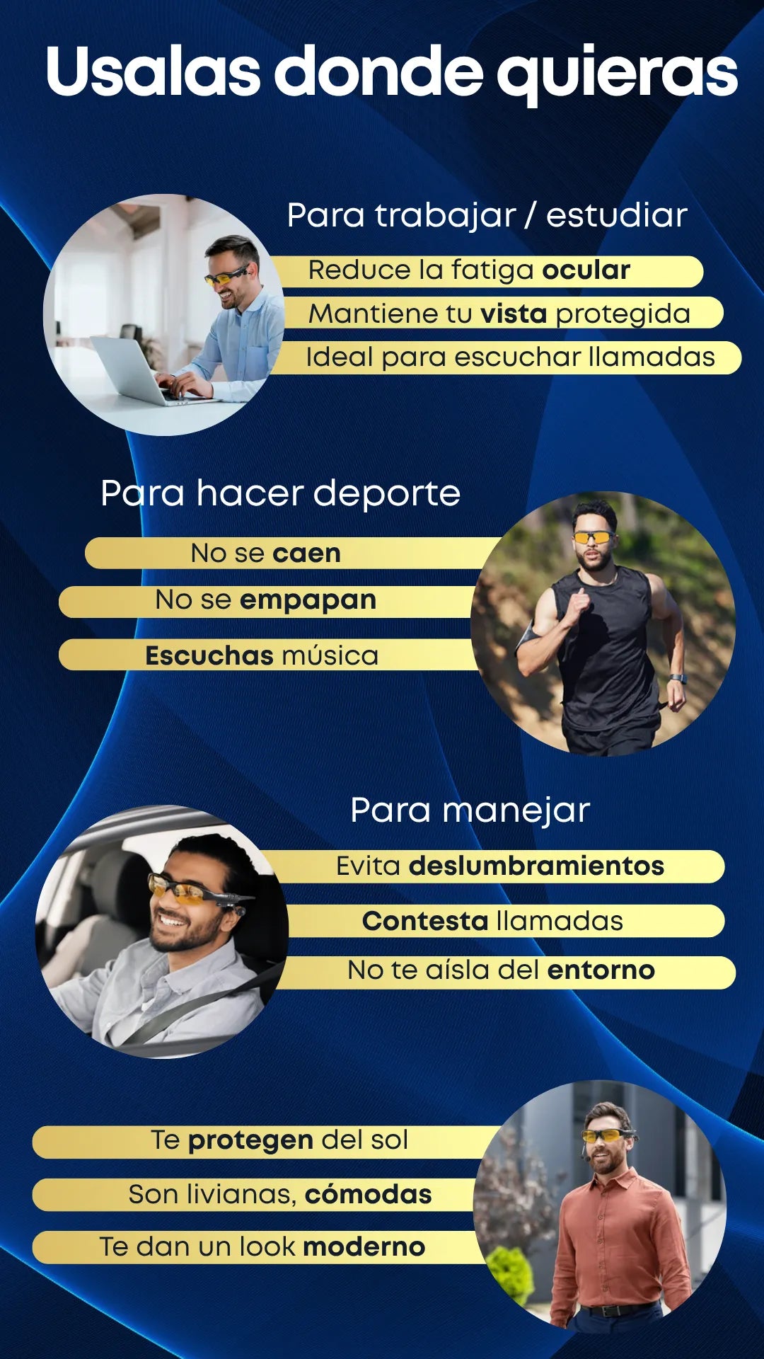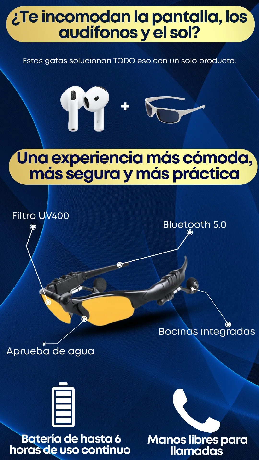 La función Bluetooth conecta rápido y no se corta. Además, filtran bien el sol. Para el precio, están calidad
