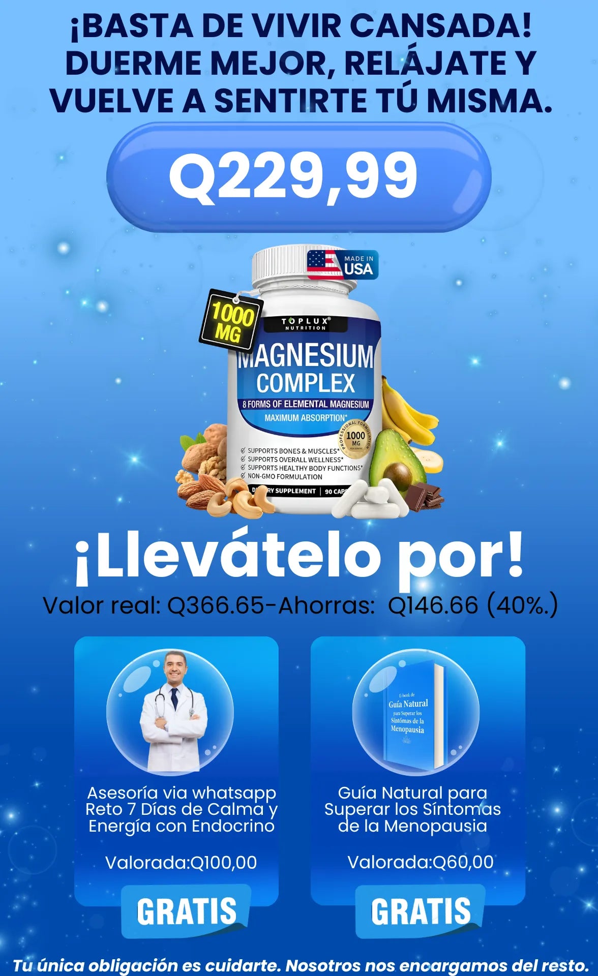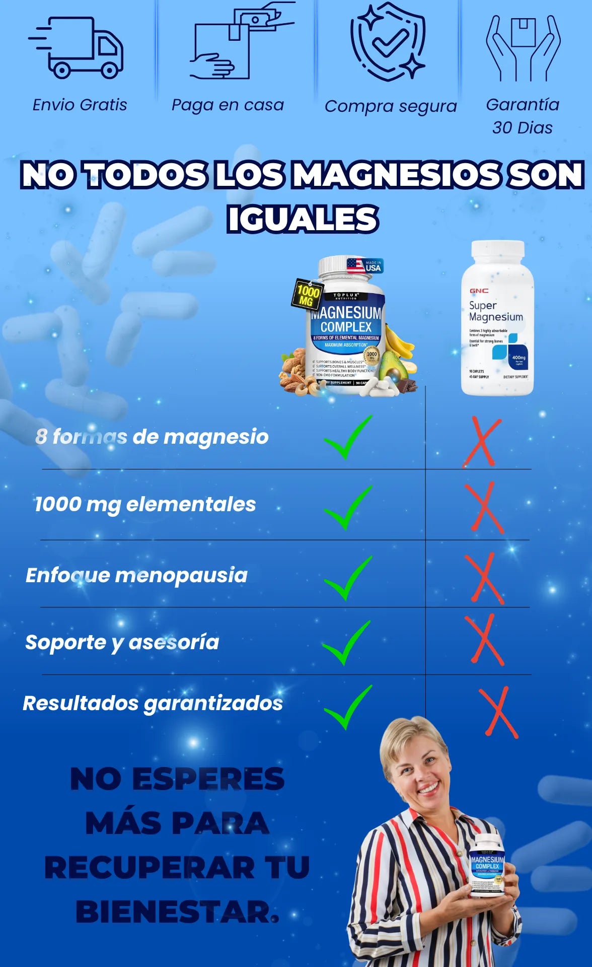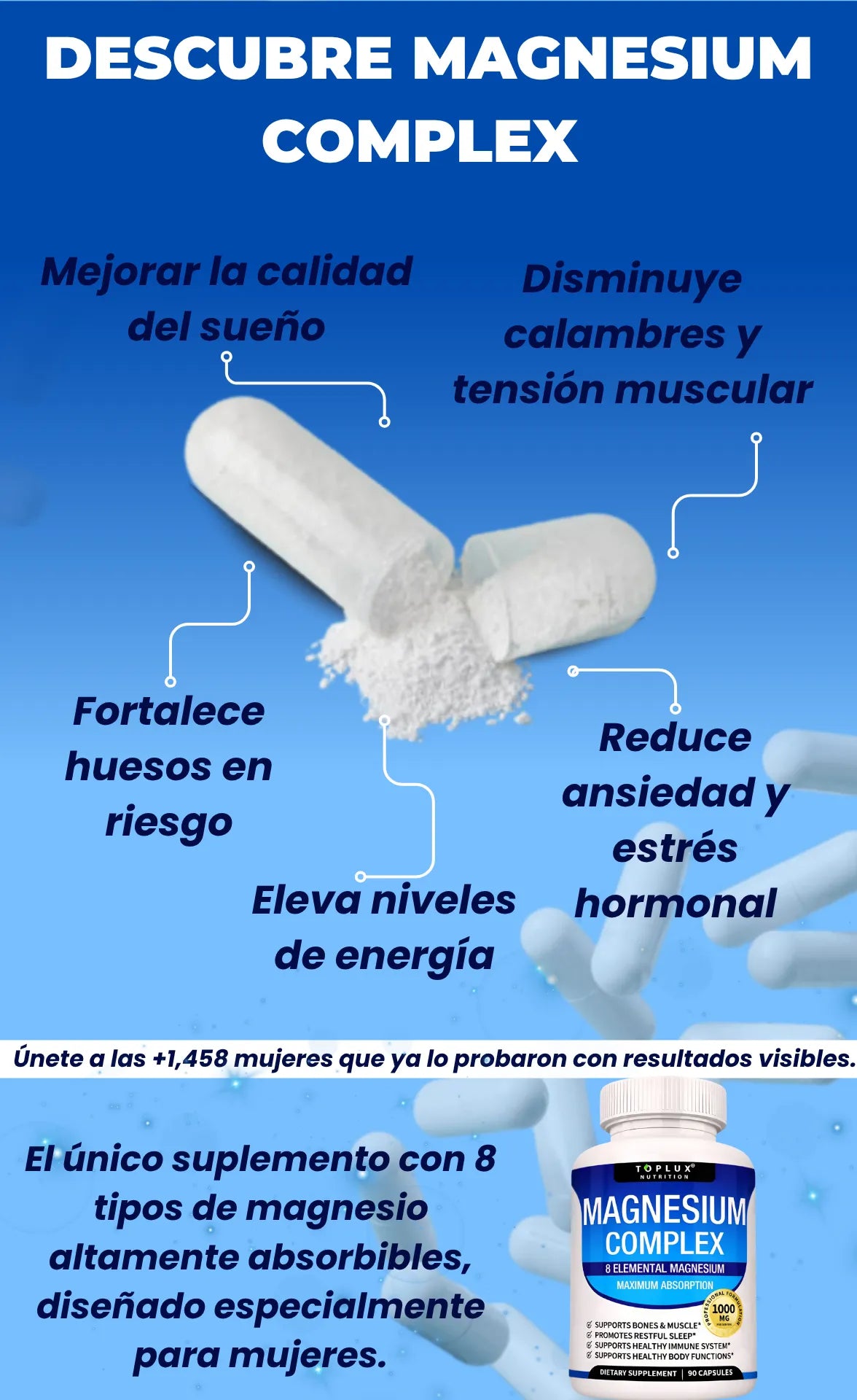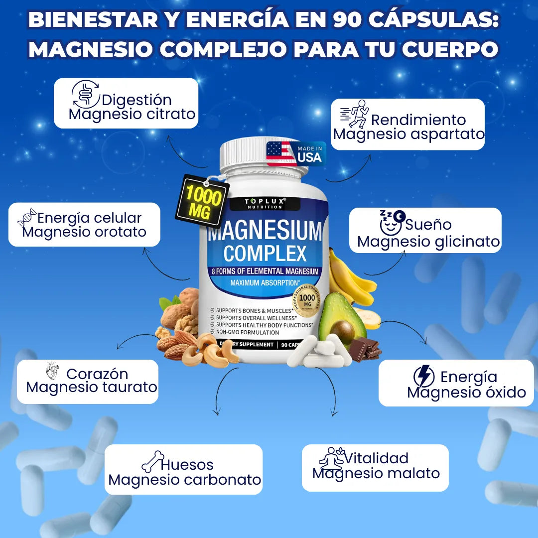 A diferencia del magnesio tradicional, este complejo combina 8 formas de magnesio elemental, lo que garantiza mayor absorción y un efecto más completo sobre el cuerpo, actuando en músculos, sistema nervioso y huesos.